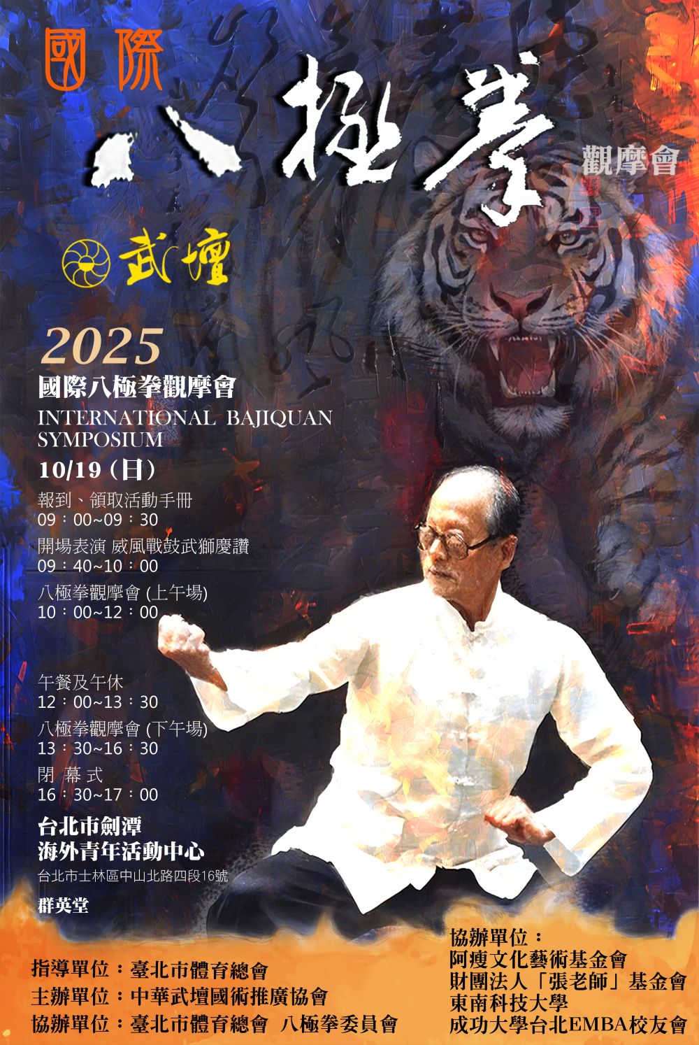 武壇觀摩會首頁 > 武壇觀摩會 觀摩會索引 請選擇 2025 第12屆傳統武術觀摩會 – 國際八極拳觀摩會 2024 第11屆傳統武術觀摩會 – 螳螂拳暨兵器展演 2023 第十屆傳統武術觀摩會 – 八卦掌III 2019 第九屆傳統武術觀摩會 – 中國兵器展演 2018 第八屆傳統武術觀摩會 - 八極拳IV 2017 第七屆傳統武術觀摩會 - 螳螂拳II 2016 第六屆傳統武術觀摩會 - 八卦掌II 2015 第五屆傳統武術觀摩會 - 八極拳III 2015 兩岸武術文化觀摩會 - 吳鐘八極拳研究會交流 2014 第四屆傳統武術觀摩會 - 八極拳II 2013 第三屆傳統武術觀摩會 - 螳螂拳 2012 第二屆傳統武術觀摩會 - 八卦掌 2011 第一屆傳統武術觀摩會 - 八極拳 2025 第12屆傳統武術觀摩會 – 國際八極拳觀摩會 活動時間:2025/10/19 活動地點:劍潭海外青年活動中心 指導單位:臺北市體育總會 主辦單位:中華武壇國術推廣協會 相關連結: 活動手冊 展演單位 精華影片 網路相簿